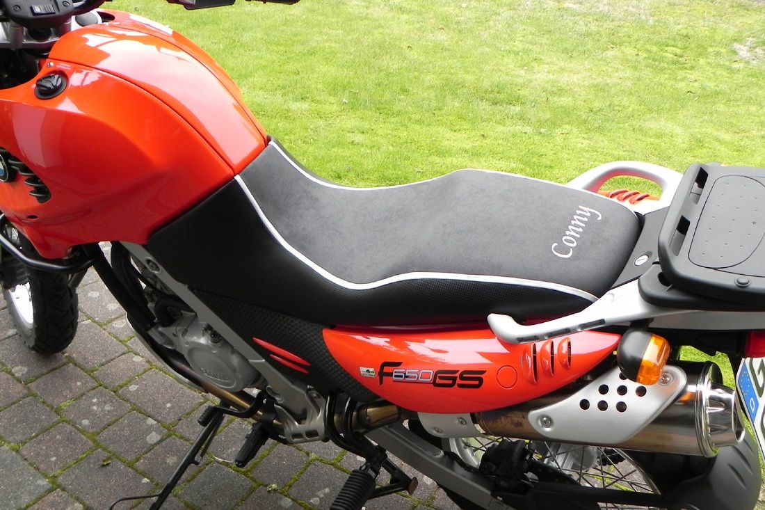 -Die BMW-650 F Sitzbank wurde im vorderen Sitzbereich 2 cm tiefergelegt und mit eine Lage a 6mm des neuen Silikonschaumstoff (Härdegrad weich) gegen "durchsitzen" wieder aufgepolstert.
