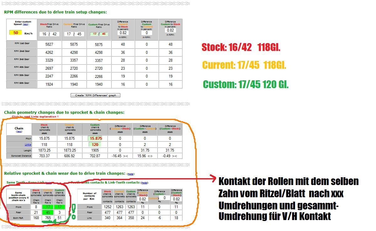 NEIN. Entweder 16/45 mit 118er Kette und Steckachse gedreht oder 17/45 mit 120er Kette. Da gibt es nichts zu rechnen. Das ist halt mal so.