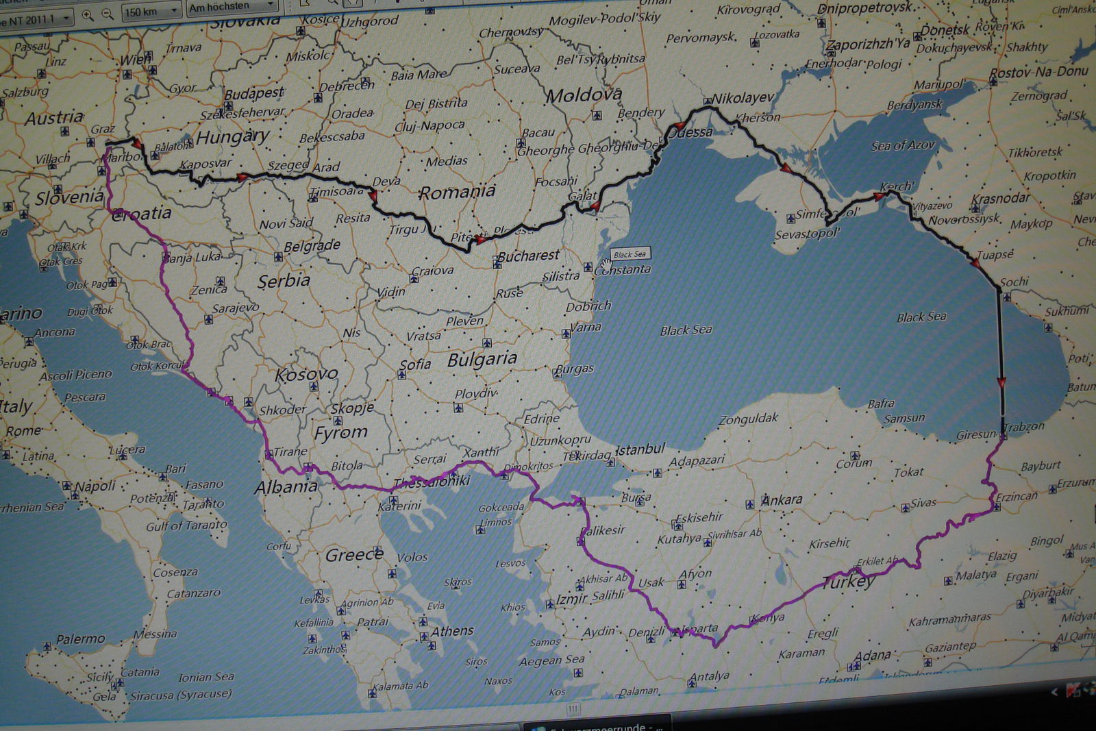 Route: Östereich-Ungarn-Rumänien-Moldavien-Ukraine-Russland-Türkei-Griechenland-Makedon ien-Albanien-Montenegro-Kroatien-Bosnien-Kroatien-Slowenien und nach Haus = ca 7500 km. Reisedauer 3,5 Wochen