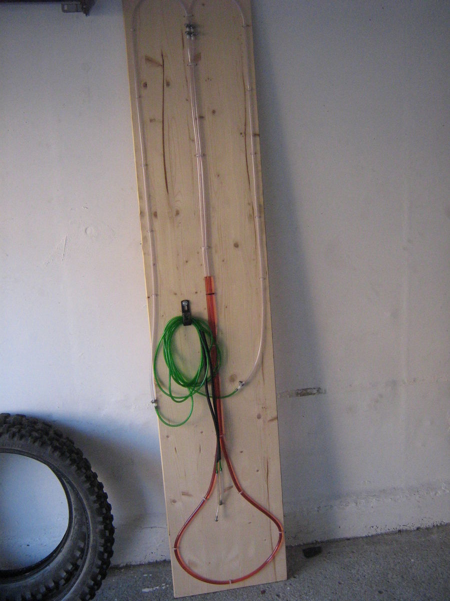 Unten den Schlauch in einem Bogen von ca. 35 auf 35 cm legen und bis an das obere Ende vom Brett nebeneinander herführen. Neben dem Schlauch immer Löcher bohren und so den Schlauch mit Kabelbindern am Brett fixieren.