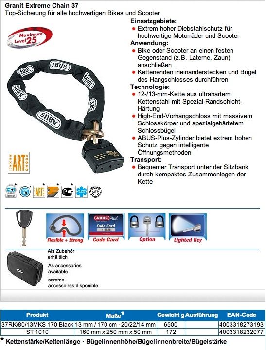 Was jedoch nicht passt: Die Kette passt nicht in die Tasche 1010 und sonst auch nur in Tankrucksack oder Koffer und meine 2 Meter Version wiegt ca. 7500 Gram !!! Also nix mit Jackentasche oder so :-(