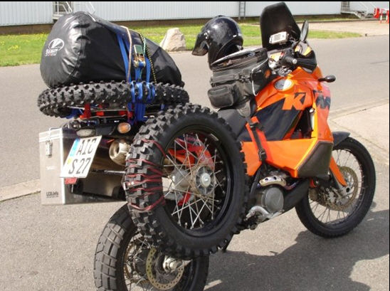 Die Wärmestrahlung der Schalldämpfer halte ich bei den zu erwartenden Abständen zum Reifen für kaum relevant. Ich würde bei deiner Planung empfehlen, die beiden Räder mittels eines Gurtes über der Sitzbank zu verbinden. Damit können meines Erachtens schon viel Schwingungen und Schläge abgefangen werden. Wenn dann eventuell noch eine Gurtverbindung zum Soziusrastenträger besteht, sollte nicht mehr viel schiefgehen. Fragen zum Verhalten der Rennleitung habe ich einfach ignoriert. Wenn du aber Stoppelreifen mit M&S Symbol mitführst sollte ein Verweis auf die Anforderungen der neuen Winterreifenverordnung möglichen Bedenkenträgern den Wind aus den Segeln nehmen.