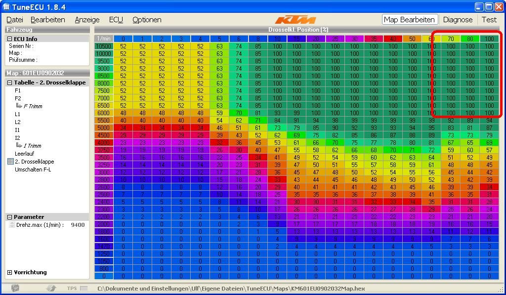 Was sonst noch passiert, was Tuneecu aber vielleicht nicht anzeigen kann, weiß ich nicht. Deswegen lieber kein komplettes Fremdmapping aufspielen sondern erst Deins auslesen und die Änderungen manuell eintippeln und wieder drauf damit. Dann bleiben immerhin alle anderen Parameter auf dein Möppi abgestimmt.