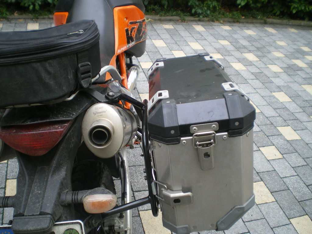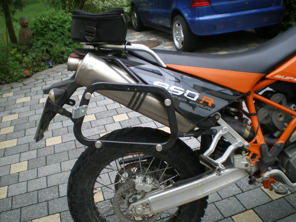 Jeder wie er mag, nur bevorzuge ich die Verstärkung des Hecks durch feste Träger. Schützen die Schalldämpfer bei leichten Stürzen und sind auch so recht praktisch ... Muss man halt selber für sich entscheiden. Reise ich oder muss ich ein aufgehübschtes Bike für die Eisdiele haben ... und so Scheiße sehen die Touratech-Kofferträger an einer SM, SE oder Advi nicht aus