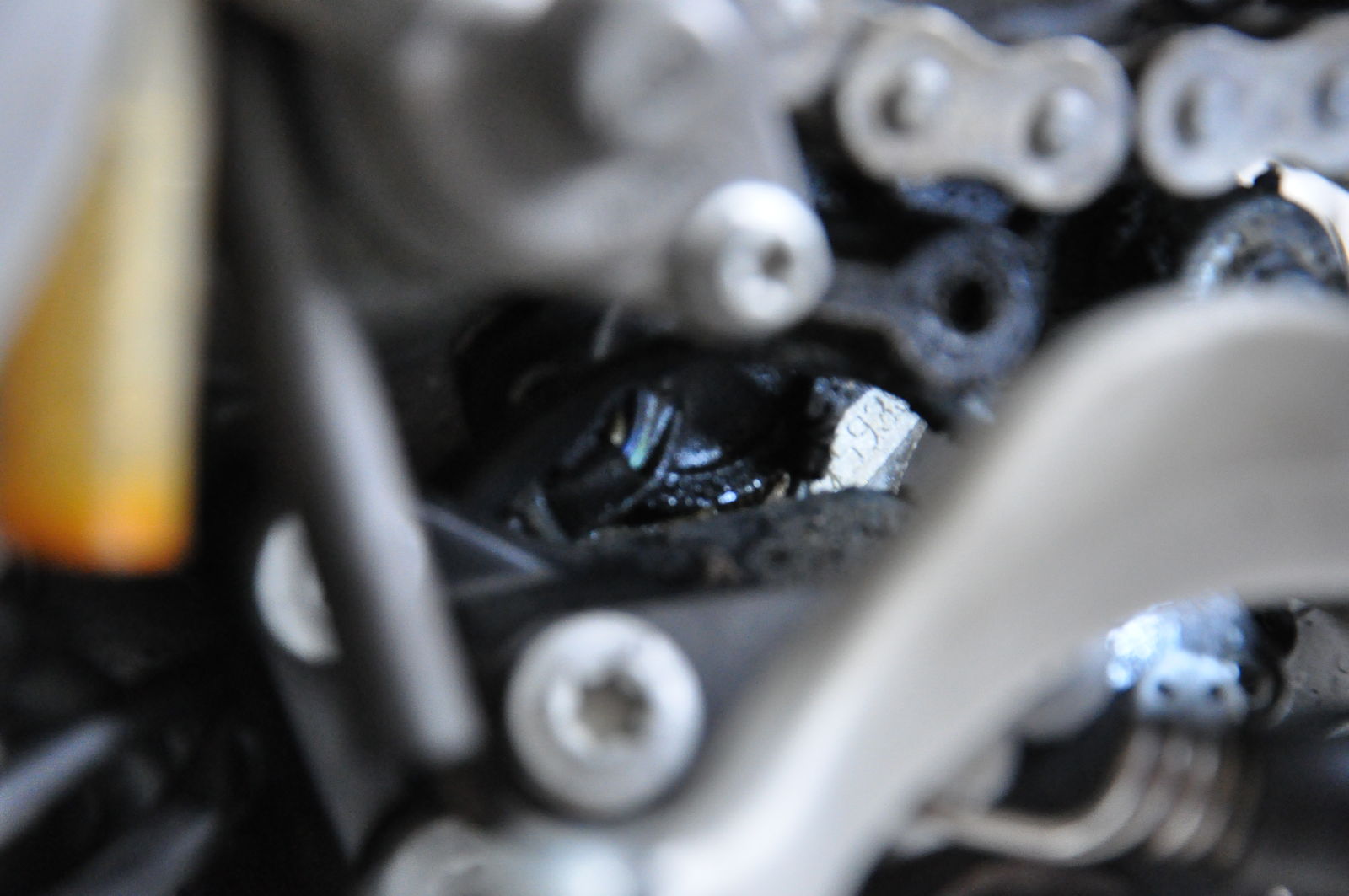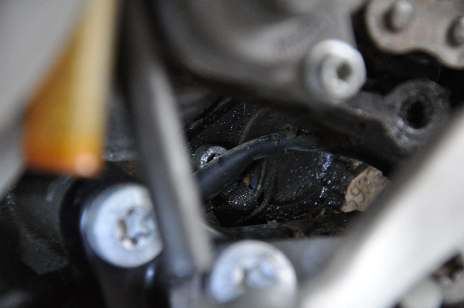 Weiter oben hinter dem Schalthebel ist etwas in den Motor geschaubt, fast mittig unterhalb des Ritzels. Drei verschiedenfarbene Kabel führen dort von vorn hinein. An der hinteren Schraube ist glaube ich ein Massekabel angeschlossen. Das Teil ist mit zwei Schrauben? befestigt, wird teilweise durch das Kabel vom Seitenständerschalter verdeckt.