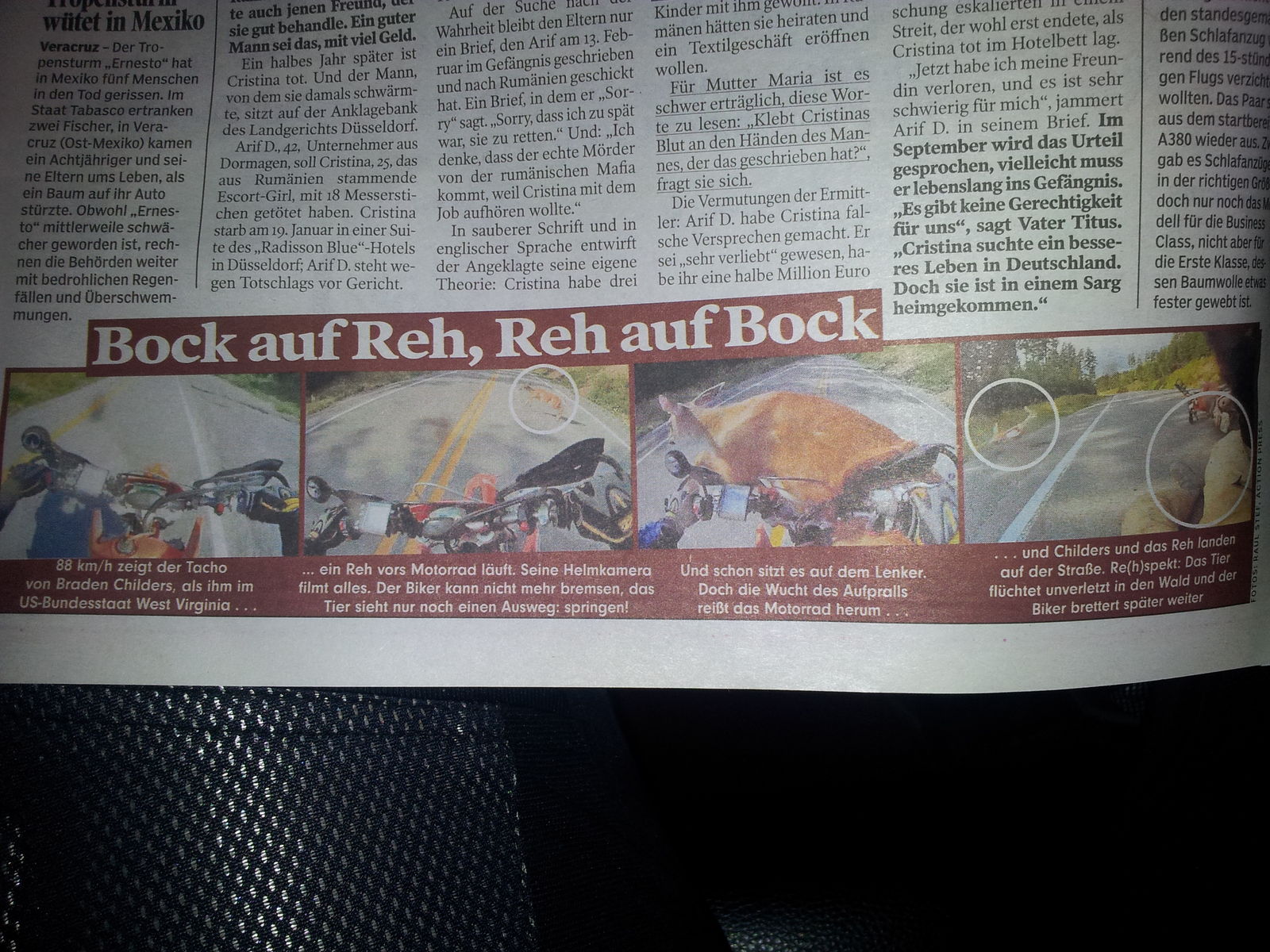 Als ich dann aufgestanden bin, hab ich mich erstmal auf verletzungen und schmerzen abgesucht. Aber nix! Alles ok. Mopped hab ich dann etwa 50m hinter mir im graben gefunden und das reh mit genick- und hüftbruch. Ein freundlicher autofahrer half mir dann beim mopped aufheben. Denn dabei hat mir mein handgelenk ziemlich weh getan.