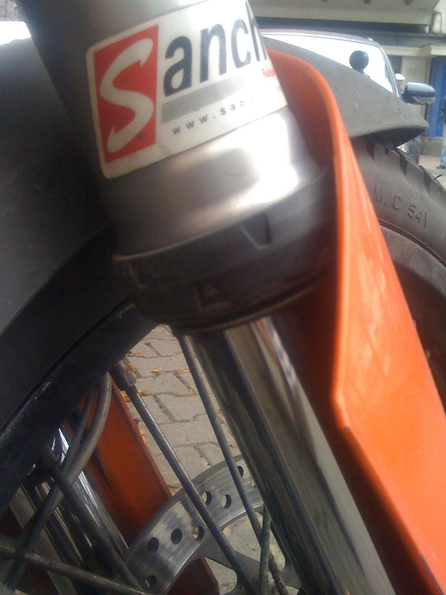 Moin, beim reinigen meiner 950´ADV ist mir aufgefallen das sich der Kotflügel vorn in die Gabelholme eingearbeitet hat. Nunja die Befestiegung unten und hinten ist nun mal nicht so star fest. Jedenfals muß ja der Koti so gegen die Gabelrohre gedrückt haben, durch den Farhrtwind wie ein Segel , und das ständige einfedern um die langen Kratzer zu verursachen.
