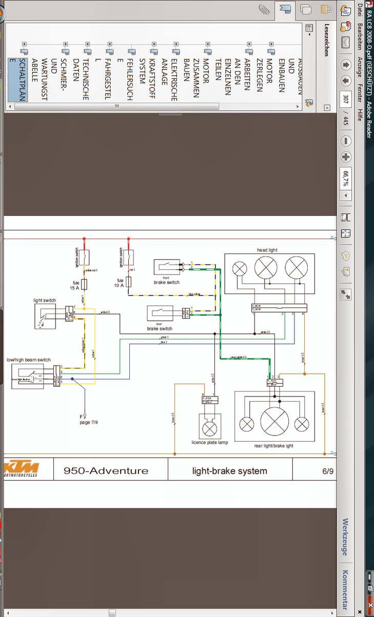 Was ich aus den Schaltplänen der 950 erkennen kann: es sind 3 Kabel (eigentlich 4, wenn man den Batterie-Plusanschluß mitzählt....gebrückt???) die aus dem Zündschalter kommen. Starterkabel, Bremslicht und Licht-Kabel....kann also genauso ein Kabelbruch am Zündschalter sein....!