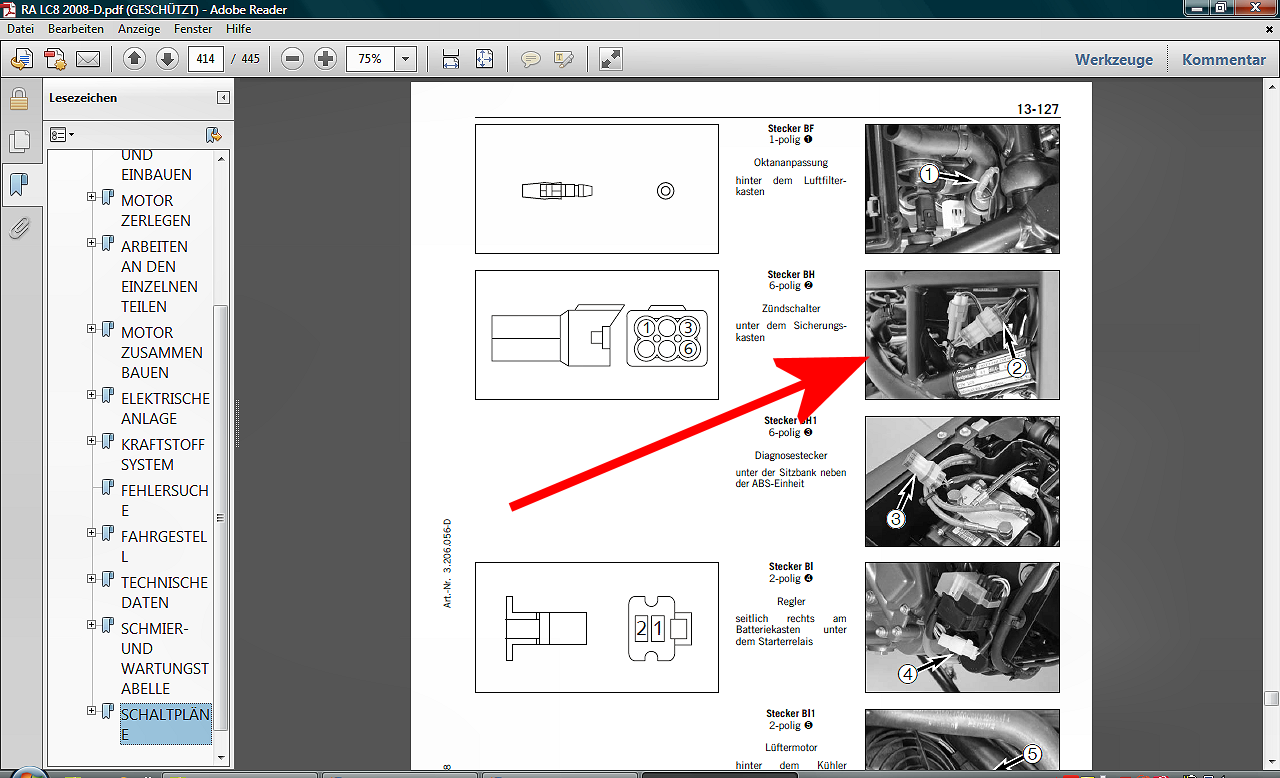 Schwierig von hier aus.... Sad ! Also, ich kann Dir noch den Schaltplan anbieten, von der 990iger ...bis 2007er Baujahr. Also nicht den ab 2007, denn den hab ich bereits hochgeladen. Dieser ummantelte Knick, alle 6 Kabel, direkt am Zündschloß...... wenn Du die bewegst, mit eingeschaltener Zündung....iss ein Unterschied zu bemerken? Oder was Du auch noch machen könntest.....an allen 6 Kabeln vorsichtig zu ziehen, in beiden Richtungen....vielleicht ist eines dabei, bei der die Isolierung länger und länger wird, oder ganz abreißt. unsure