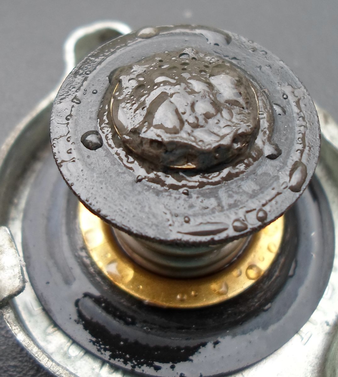 Heut hab ich mir aber mal einen neuen Kühlerdeckel gekauft (auch 1,4bar) und siehe da - diese kleine Dichtung, die auf dem Foto voller Schleim ist, sitzt auf dem neuen sehr fest und auch das kleine Messingplättchen ist ziemlich fest im neuen Deckel.