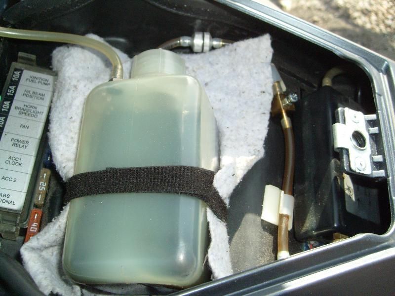 Zuerst würde ich die rechte (!) Hamsterbacke abbauen, die Tankschrauben rechter Tank etwas lockern (nicht rausschrauben!), damit Du den Tank ein wenig "bewegen kannst, denn für eine kurze Strecke muß das Kabel am Rahmen lang unter den Tank gepfriemelt werden. Je nachdem wo Du die Steuereinheit und den kleinen Tank unterbringst halt drauf achten, das die Kabel den Lenkereinschlag nicht behindern, oder dadurch die Kabel hin und her gezogen werden. Das Kabel runter verlegen, Richtung Batterie-Kasten (alles mit Kabelbinder gut fixieren), auf Hitze von Krümmer und Kühler achten, bis Du rechtsseitig des Batteriekastens bist. Dort gibt es ein kleines Loch, wo Du den Plus in den Kasten führen kannst, ohne das Kabel irgendwo "zwicken" zu müssen (siehe gelben Kreis auf dem Foto). Den Minus würde ich mit Kabelschuh dort unten anbringen, am Gehäuse, wo Du schon ein Kabel angebracht siehst (vom Laderegler). Einfach daneben ne Schraube rausdrehen und den Minus dran festschrauben....that´s it!