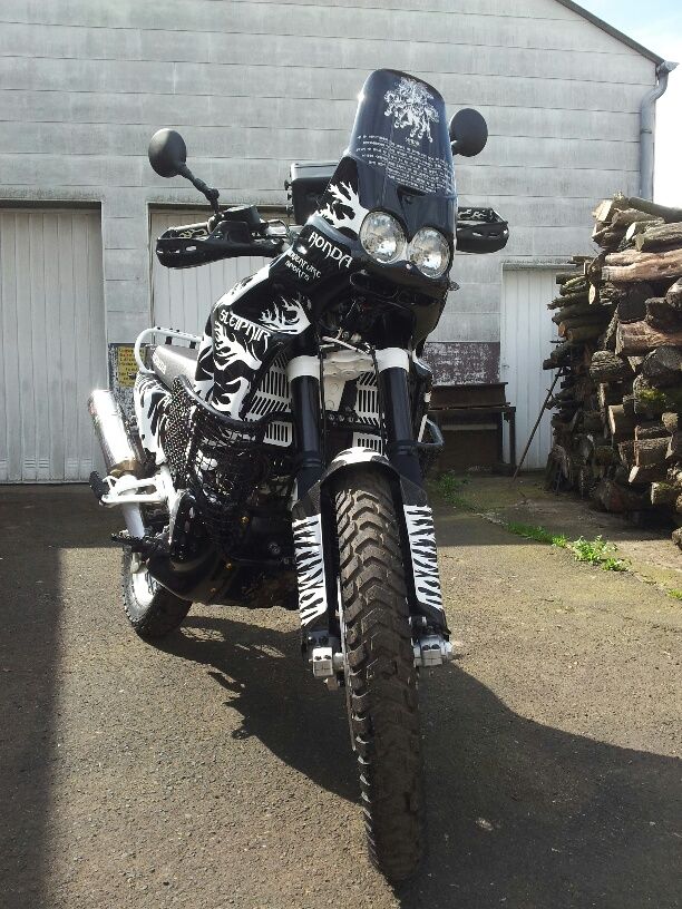 Es ist endlich vollbracht. Seit Anfang November habe ich jede freie Minute – man schreibt das manchmal so, um etwas zu dramatisieren, in meinem Fall war es aber genau so – in den Umbau meiner Africa Twin gesteckt. Heute hat sich aber herauskristallisiert, dass sich alles investierte Blut, Schweiß, Nerven, Zeit, Geduld, Terminplanerei, Telefoniererei, Mailerei, Stunden am Rechner, um Designs zu entwickeln/anzupassen, Schrauberei, etc., mehr als nur gelohnt haben. Ganz besonderen Dank möchte ich aber allem voran an all diejenigen hier kundtun, die mir bei meinem Umbauprojekt tatkräftig Support geleistet haben. Ohne eine Gewichtung in der Reihenfolge zu haben (!), seien hier insbesondere aus meinem "Heimatforum" Korni für die Ralleyverkleidung, den SiXO, das Dashboard und den Halter für Fackeln und Dashboard, Dannidanone, Gerd, BenRD und Armin für Tipps und Anregungen, Richard (Büchele) für den Magneten für das Tachosignal, ninjadaniel aus der Bucht mir der optisch wie für mich gemachten Gabel (jedenfalls vom Grund her die richtige – nämlich ne SCHWARZE WP4860 CC aus einer KTM 690 Enduro, die erst 100km gelaufen war), hier, aus dem LC8-Forum, Hannes aus Österreich für ein nur zu Testzwecken in einer Hochschule gelaufenen und damit neuwertigen Vorderrad einer KTM 950 Adventure aus 2003, Nimrod für die Teile der LC8, die mir für den Umbau des Vorderbaus (Gabel und VR) noch fehlten, Schradt (Admin), Joe Fanatic, Turbodiesel, meine Fahrwerksbauer, WP Germany (Christian Meier) und Fejfar (Werner Fejfar), mein Bruder Knut für die Produktion der Drehteile für den Hinterradumbau, natürlich auch die Männer rund um das SiXO-Projekt (Arnold Neugebauer, Ralf Schwarzer und Andreas Maar), meine Lackiererei GROSS GmbH in Büdingen (Alexander Goll), mein Strahler und Pulverbeschichter BAMBERGER in Hanau (Tom Schäfer und Markus Bamberger), Motobau Berlin (Kai Liebisch) für den megageilen Support bzgl. Teilen (unter anderem in Bezug auf die von ihm für den Einbau in eine Africa Twin umgebaute Gabelbrücke einer LC8 Adventure) und die ständige Motivation, mir bei Fragen zu helfen, Siggi-EL für die Unterstützung beim Einbau der SPY 5000, hh-ractech, meiner Tochter für ihr Verständnis und die Motivation auch mal alleine klar zu kommen und last but not least meine „Uffbappschermenschen“ (Fa. Schilder Traxel in Hanau - Michael Schönstein sowie Revex iBox in Schwarzenbach a. W. – Julian Pätzold, der mir Odin auf Sleipnir mit Text produzierte), erwähnt. Ohne die Jungs hier, hätte ich dieses Projekt niemals nie nicht in dieser Form und in dieser Zeit durchziehen können. Erstmalig in meinem Leben habe ich mich überhaupt an so einen Umbau gewagt. Noch bis ca. Anfang Januar stand eigentlich fest, dass diesen Winter nur Verkleidung, SiXO und Hinterrad umgebaut werden; erst nächsten Winter sollten dann die Fahrwerksteile und die damit zusammenhängenden Umbauten folgen. Durch die Verquickung mehrerer, günstiger Schicksalsfügungen (Partnerin weg, genug Zeit und Kohlen und das dann plötzlich doch schnellere Auffinden von Teilen für diesen Umbau) haben mich im Januar/Februar aber dazu bewegt, gleich alles in einem Aufwasch zu machen. Zur Einzelabnahme der Umbauten musste ich eh, also kann ich die Sache mit dem Fahrwerk auch gleich mitmachen. Gesagt, getan. Leider gab es dann mit den benötigten Teilen beider Fahrwerke (Gabel und Dämpfer) Schwierigkeiten, die das ganze Projekt um ca. 3 Wochen außerplanmäßig verzögerten. Aus meinen Erfahrungen weiß ich, dass es zu Verzögerungen kommt, wenn man auf externe Gewerke angewiesen ist – die Erfahrung ist halt ein guter Lehrmeister. Insofern konnte ich immer noch ziemlich gechillt damit umgehen und habe mich in der Zwischenzeit immer mit Dingen beschäftigt, die auch gemacht werden müssen. Das meinte ich anfangs unter anderem mit Terminplanung. Nicht ganz einfach, aber als „Organisator“ in meinem Job fällt mir das nicht gar so schwer. Es macht halt Sinn, die Arbeiten so zurecht zu basteln, dass man in den Zeiten, während externe Gewerke „zuliefern“, Dinge erledigt, die dann mit dem Liefertermin der zurückkommenden Teile harmonieren. Passt nicht immer perfekt, aber bei einem solchen Projekt ist ein guter Plan hilfreich, auch wenn er nicht immer zu 100% aufgeht. Selbst der beste Plan übersteht ja oft die 1. Schlacht nicht mal.
