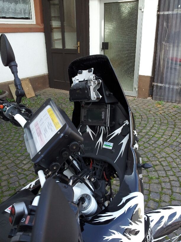 - Navi-Halter für mein TomTom Rider II von Touratech – beide Navigationsinstrumente werden über einen Schalter mit Spannung versorgt/vom Bordnetz entkoppelt
