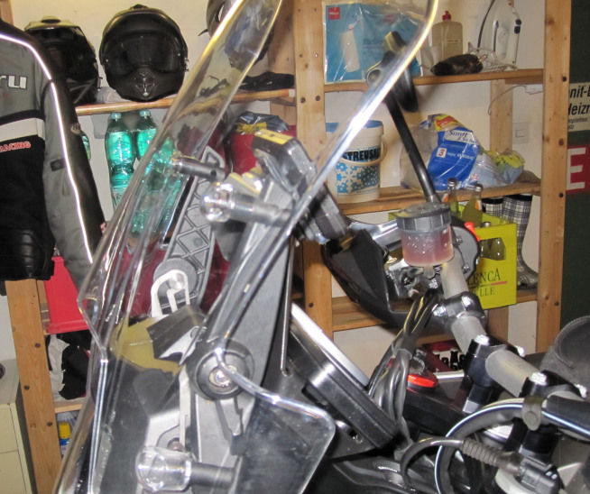 Ich muss jetzt nach 500 km auch sagen, dass ich keine passende Stellung für das Original-Windschild gefunden habe. Die Höhe wäre mir eigentlich (auch optisch ausreichend), aber man müsste es einen Tick steiler stellen können. Das lässt der Mechanismus aber nicht zu.
