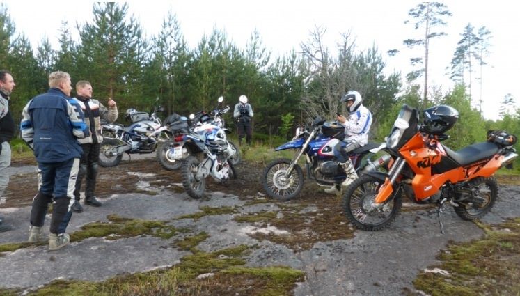 Dieser Tag empfing uns in Form eines ausgiebigen Wolkenbruchs. Doch wir hatten Glück: der Wolkenbruch ging in einen 24h-Dauerregen über. Bei knackigen 3 Grad durften wir unsere Enduroklamotten aus der 90 Grad Sauna holen. Leider speicherten die Kleidung die Wärme nicht lange. Die Witterungsbedingungen zwangen uns dazu uns in 2 Gruppen aufzuteilen. Eine HP2 Prenium (Slowmotion) und eine R 100 GS und LC 8 Hardcore Gruppe zu machen. Ich kann nur von der einen Gruppe erzählen. Bei uns ging es teilweise recht knackig zu, die Navigation war auch ganz schön anspruchsvoll. Der heutige Tag endet mit dem Besuch bei dem Besitzer mit der einzigen in Finnland zugelassenen BMW HP2. Alle BMW Fahrer wurden herzlich empfangen und bekamen eine trockene Unterkunft. Den Abend beendeten wir mit einem aufwärmenden Saunagang und dem Grillen mehrerer Fische. Wir bewiesen Herz und ließen auch Wolfgang unseren KTM Fahrer in dieser Herberge schlafen.. Unter Bikern lässt man sich gegenseitig nicht im Stich.