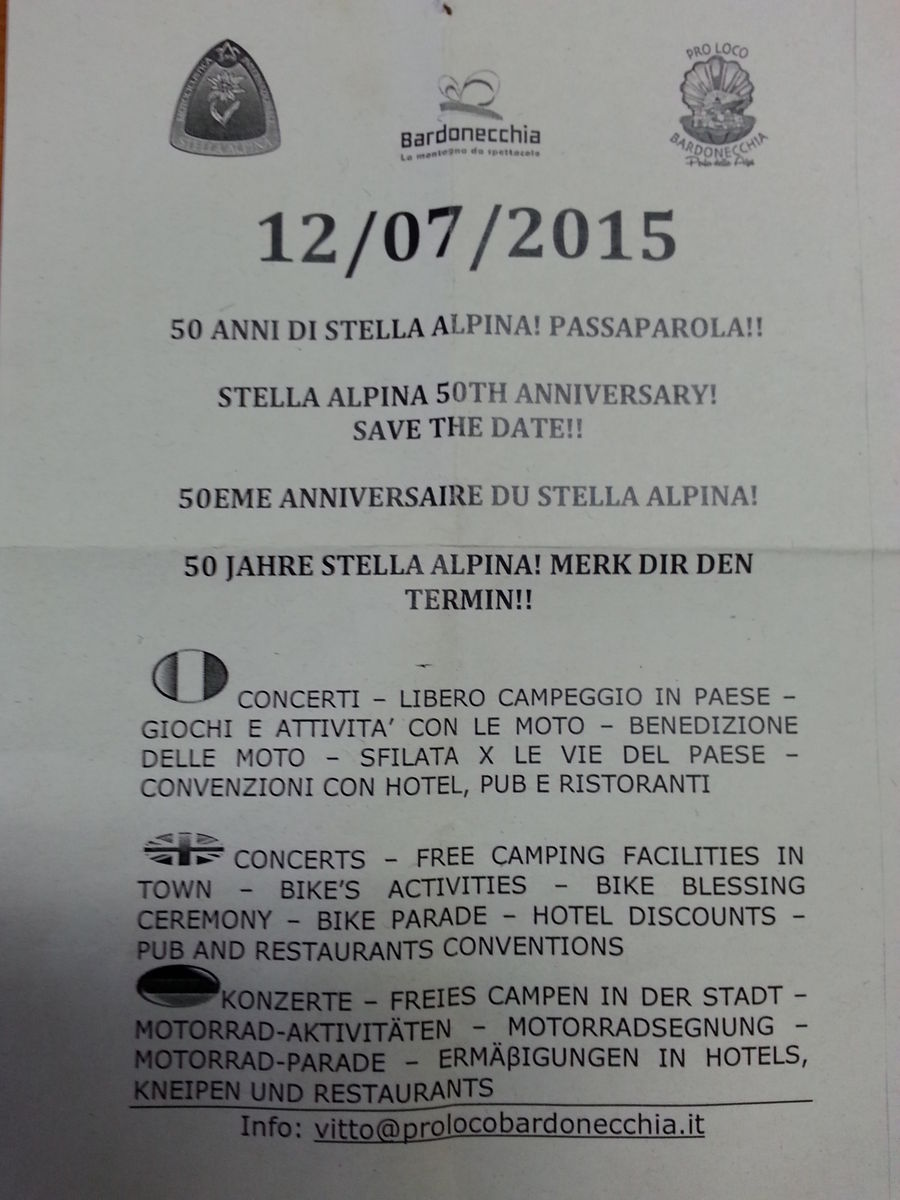 Man tut sich in Gruppen zum Fahren zusammen, offroad zu den Forts, onroad über die Pässe oder was auch immer. Dazu gemütliches Beisammensein mit Grillen und chillen. Und am Ende der Woche zur 50.sten STELLA ALPINA, mit Sonderprogrammen in Bardonecchia!