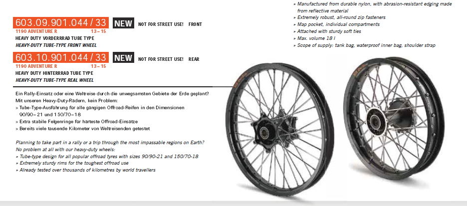 Lt. PP Katalog gibt es nun auch einen Felgensatz für Schlauch-Reifen von KTM für die 1190R > siehe Bild im Anhang. Das könnte vorne die SE-Felge mit der entsprechenden Nabe sein.... aber hinten kann ich mir keine 2,5" Felge vorstellen ( auch wenn DID DirtStar wie bei der SE draufsteht ), da sie ja angeblich für 150er Hinterreifen passen sollte. Mein Smile hat in seinem System auch nur die Infos der Durchmesser 18" und 21", aber keine Felgenbreiten. Listenpreise lt. meinem Smile Hinterrad 18" kpl. 594,00 € und Vorderrad 21" kpl. 623,00 €. Lieferbar allerdings erst ab Ende April / Anfang Mai.