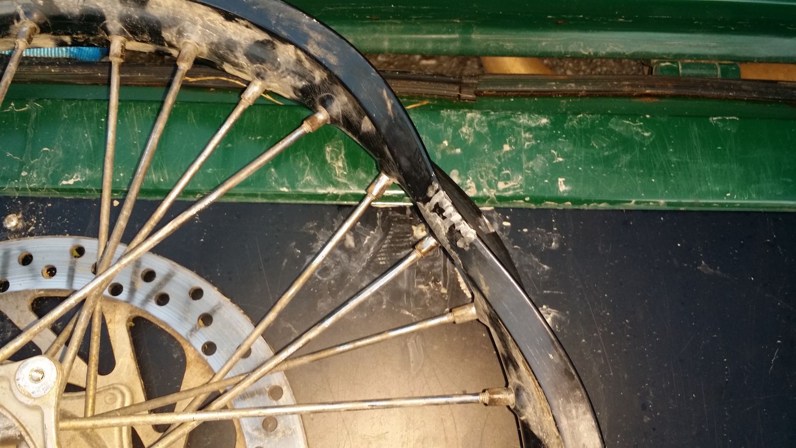 Wie Spacegear richtig anmerkte, es ist keine "Butterfelge" von der 950er sondern eine Morad 1,85 x21" Felge, das Rad wurde wohl mal bei LoLo gebaut. Bisher gab es auch absolut nichts zu beanstanden. Ich hatte schon Einschläge beim Fahren wo ich dachte uihuihuih, das gibt Kanten. Aber nein, alles Rodscher. Die Reparatur wird mit Sicherheit im Tausch der Felge bestehen.
