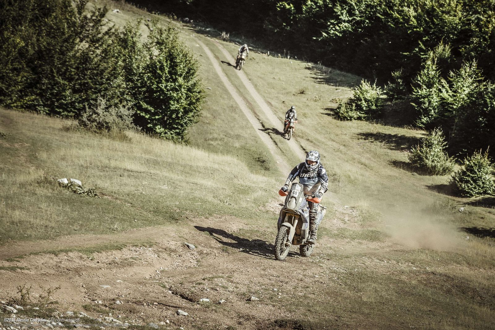 Wie von Max bei der Präsentation der Veranstaltung vorausgesagt, war (bei den Wetterbedingungen, welche wir vorfanden) die ganze Strecke mit der LC8 zu bewerkstelligen. Den Nachweis haben Kiesel und Jens souverän erbracht, der limitierende Faktor war eher der Fahrer – das habe ich gemerkt. Es war wirklich sehr abwechslungsreich. Die teilweise recht langen Tagesetappen (260-340km) waren geprägt von den unterschiedlichsten Aggregatzuständen von Schotter und Stein (grob, fein, scharfkantig, rund, lose, fest) teilweise lehmigen Waldwegen, Gras, langen Auf- und Abfahrten, kurzen steilen Anstiegen und Abfahrten, gern auch in Kombination mit Auswaschungen und ähnlichem und sehr wenig Asphalt.