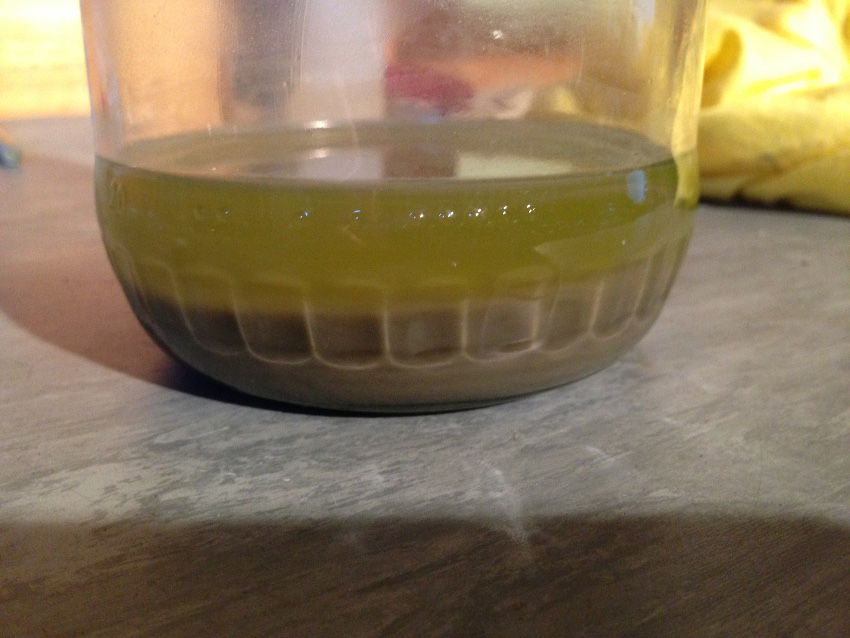 Schaut zwar nicht ganz so grass aus, aber wenn die Flüssigkeit aus dem Ausgleichsbehälter in einem Glas einen Tag steht, sieht man doch unten eine graue und oben die noch etwas grüne Schicht.
