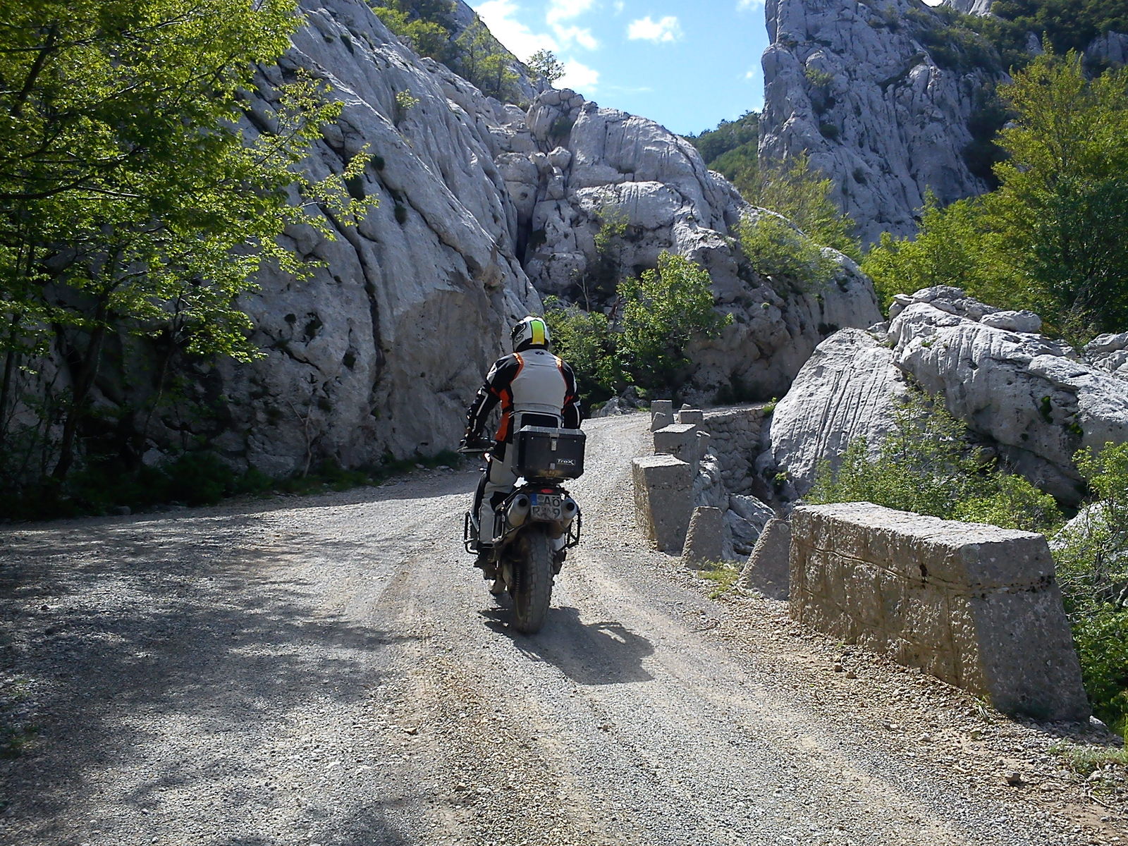 Abstecher von der Küstenstraße ins Gebirge rauf sind immer empfehlenswert. Das Spektrum reicht von gut geteerten, kurvenreichen Hauptstrecken (z.B. von Senj zu den Plitvicer Seen) bis hin zu Singletrack Schotterpassagen, auf denen man ab und zu auf nen Bauern, Waldarbeiter oder Harvester trifft... Laughing