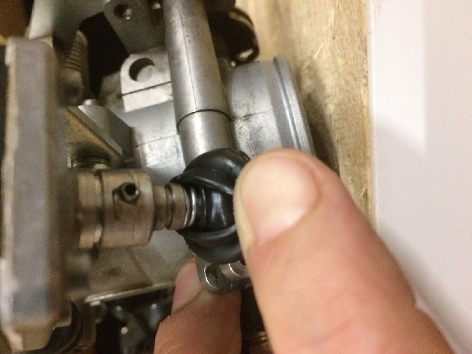 Am Stellmotor (unter dem Faltenbalg) ist ein Gestänge. Aus diesem Motor kommt ein Rohr. In eben diesem Rohr sitzt eine Stange, die am Ende eine Mutter zum Befestigen an der Stellmimik hat. Diese Stange ist im Rohr wahrscheinlich mit einer Madenschraube (Kopf außen am Rohr sichtbar) entweder gesichert oder festgeschraubt. Oder sie dient zum Einstellen der Stellstange?