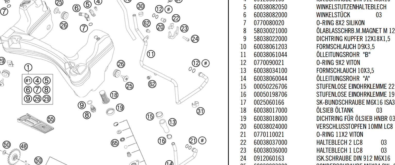 Die #9 auf der Zeichnung. Soweit ich mich noch erinnern kann, sollte die Breite der Scheibe stimmen, nicht breiter als die Schraubenkopf-Breite (falls Du nicht direkt bei KTM kaufst), da es eine leichte Tiefe am Gewindeeingang gibt und die Scheibe sonst nicht richtig abdichten kann, wenn sie im Durchmesser breiter ist als angegeben!