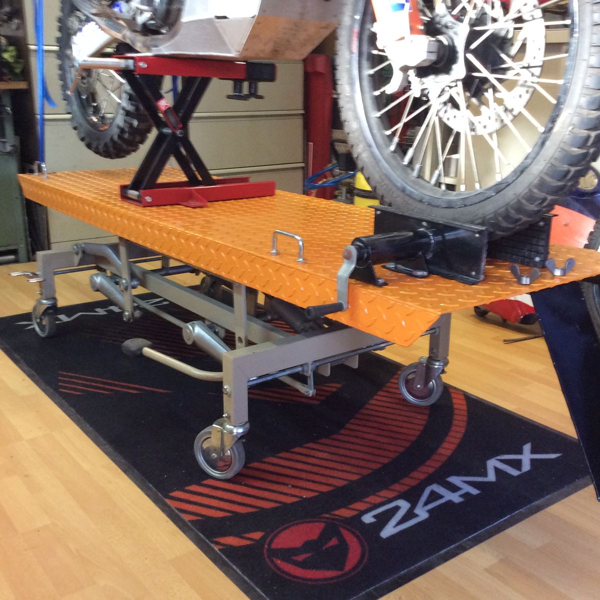 Drauf schieben muss ich die @ über eine 1m lange Rampe. Ist nicht leicht aber passt noch. Sollte der Winkel der Rampe zu steil werden kommen noch mal 50cm ran. Ich kann die volle Höhe meiner Bühne nicht mal ausnutzen, da meine Garage so niedrig ist und mein Navi-Gerödel am Moped bei 1,5m endet.