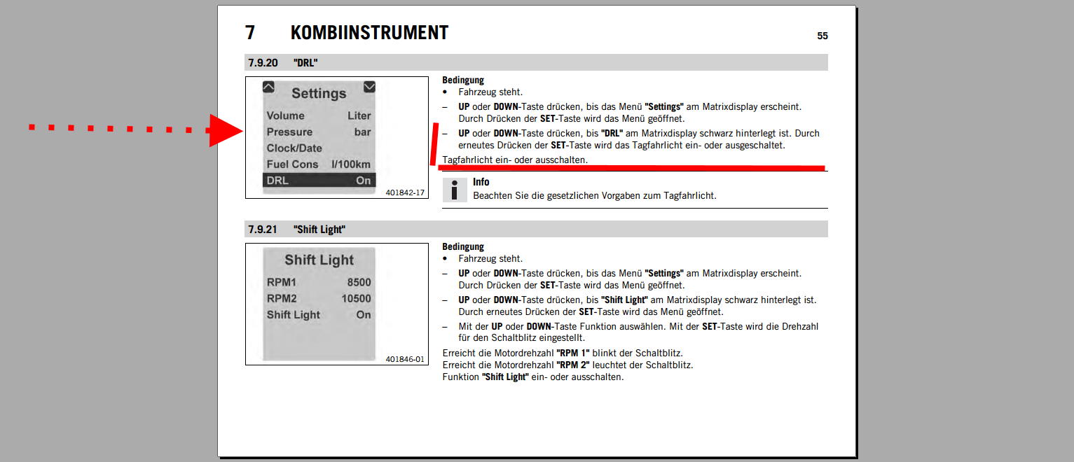 Also, bei meiner 2013er 1190ig läßt sich per Eingriff ins Menü (Kombi-Schalter) nur das LED Tageslicht einschalten, ohne die Tageslicht-Glühlampe (so fahre ich auch immer)...........probiere das mal! Siehe Anhang!