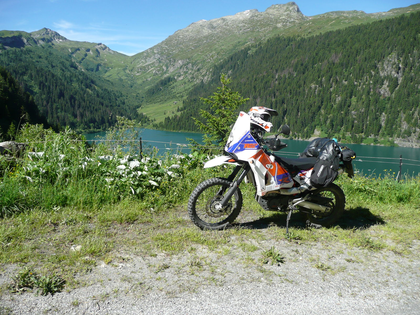 sicher einerseits Geschmacksache mit dem hufeisenförmigen Hemisphere von ADVRIDER. Aber die Chose ist insgesamt formstabiler, als es auf meinen Fotos nur mit montiertem Tragesystem rüberkommt. Der Packsack steht ja nur mit seinen "Füßen" links und rechts im Holster. Er ist einteilig und wird von oben komplett beladen. D.h. einmal vollgepackt, behält er seine Form und die zu den Soziusrasten hin abgespannten Seiten können kaum nach innen pendeln in Fahrt. Auch sind die Gurtabspannungen sehr grob gewoben und kräftig, da rutscht also nichts durch die Schnallen. Jedenfalls mußte ich bisher kein einziges Mal unterwegs nachspannen, auch nicht nach Holperstrecken à la Cormet d´Arêches, Assietta oder Colle Sommeiller. Hier nochmal zwei andere Fotos, mit vollbepacktem Hemisphere. Hält bombig - aber daß diese Art der Gepäcktasche nicht jedermanns Geschmack treffen kann, ist mir bewußt.