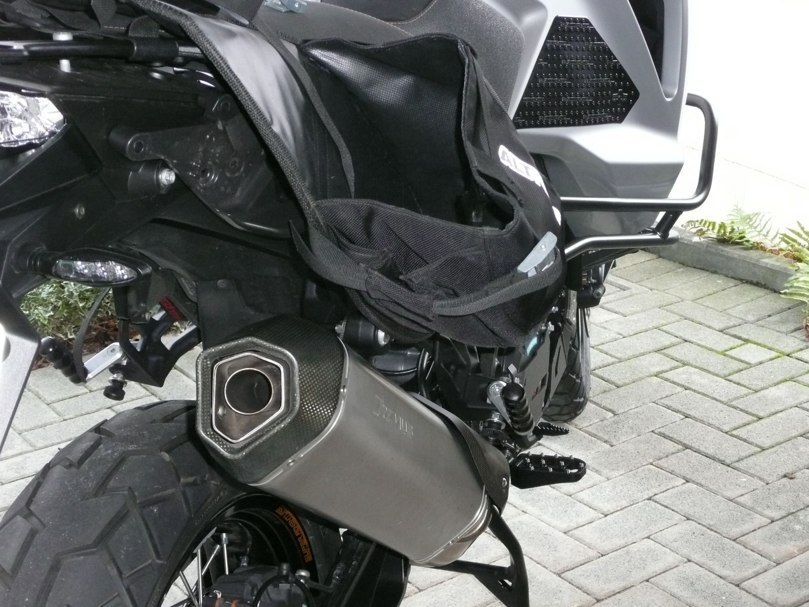 sicher einerseits Geschmacksache mit dem hufeisenförmigen Hemisphere von ADVRIDER. Aber die Chose ist insgesamt formstabiler, als es auf meinen Fotos nur mit montiertem Tragesystem rüberkommt. Der Packsack steht ja nur mit seinen "Füßen" links und rechts im Holster. Er ist einteilig und wird von oben komplett beladen. D.h. einmal vollgepackt, behält er seine Form und die zu den Soziusrasten hin abgespannten Seiten können kaum nach innen pendeln in Fahrt. Auch sind die Gurtabspannungen sehr grob gewoben und kräftig, da rutscht also nichts durch die Schnallen. Jedenfalls mußte ich bisher kein einziges Mal unterwegs nachspannen, auch nicht nach Holperstrecken à la Cormet d´Arêches, Assietta oder Colle Sommeiller. Hier nochmal zwei andere Fotos, mit vollbepacktem Hemisphere. Hält bombig - aber daß diese Art der Gepäcktasche nicht jedermanns Geschmack treffen kann, ist mir bewußt.