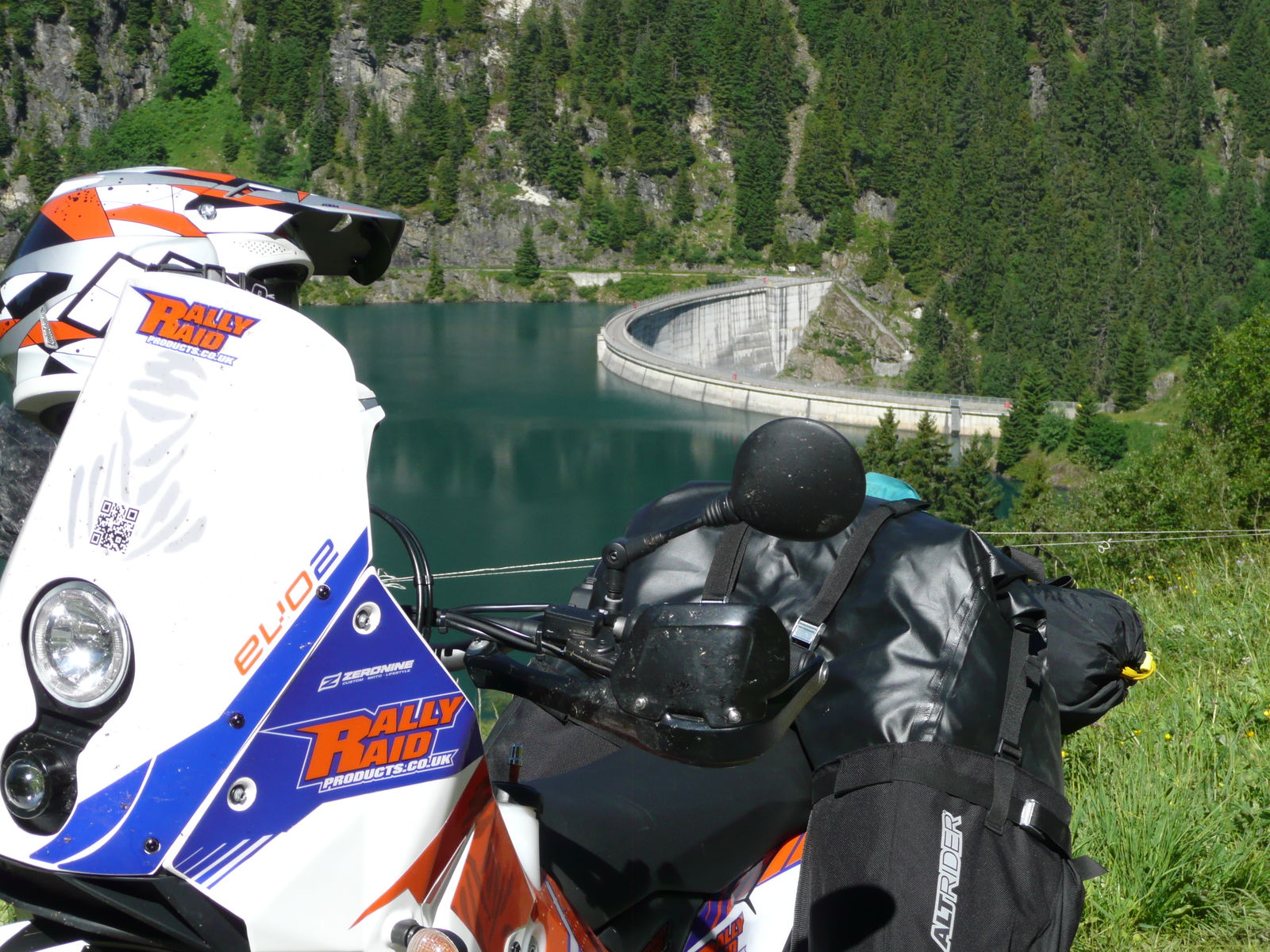 sicher einerseits Geschmacksache mit dem hufeisenförmigen Hemisphere von ADVRIDER. Aber die Chose ist insgesamt formstabiler, als es auf meinen Fotos nur mit montiertem Tragesystem rüberkommt. Der Packsack steht ja nur mit seinen "Füßen" links und rechts im Holster. Er ist einteilig und wird von oben komplett beladen. D.h. einmal vollgepackt, behält er seine Form und die zu den Soziusrasten hin abgespannten Seiten können kaum nach innen pendeln in Fahrt. Auch sind die Gurtabspannungen sehr grob gewoben und kräftig, da rutscht also nichts durch die Schnallen. Jedenfalls mußte ich bisher kein einziges Mal unterwegs nachspannen, auch nicht nach Holperstrecken à la Cormet d´Arêches, Assietta oder Colle Sommeiller. Hier nochmal zwei andere Fotos, mit vollbepacktem Hemisphere. Hält bombig - aber daß diese Art der Gepäcktasche nicht jedermanns Geschmack treffen kann, ist mir bewußt.