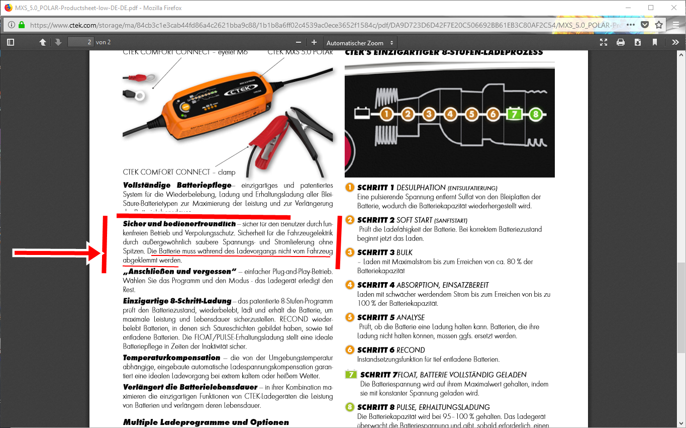 Das Argument, daß CTEK das Laden bei eingebauter Batterie empfiehlt, ist natürlich einleuchtend. Welcher Hersteller macht so etwas schon, wenn Klagen drohen würden?