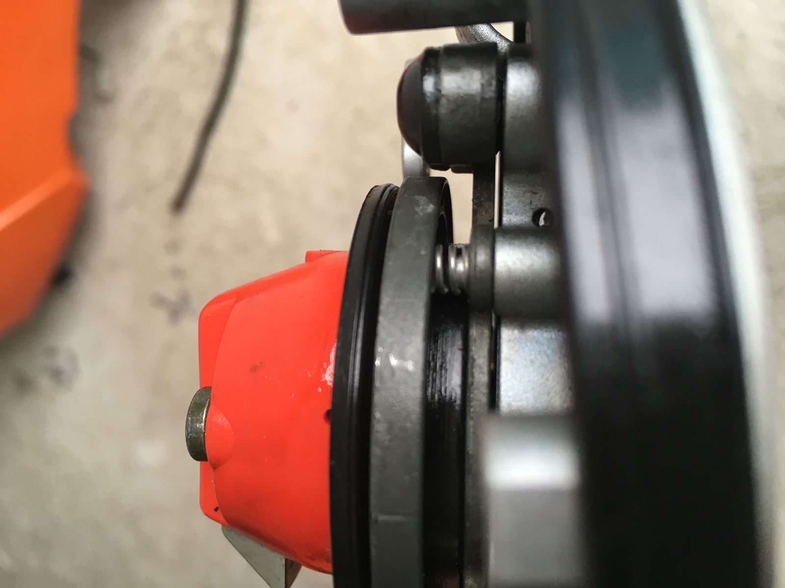 - Der federbelastete Metallring auf der Deckeldichtung liegt mit seiner Markierung (Nase) genau entgegengesetzt, also bei geschlossenem Deckel nach vorne in Fahrtrichtung.