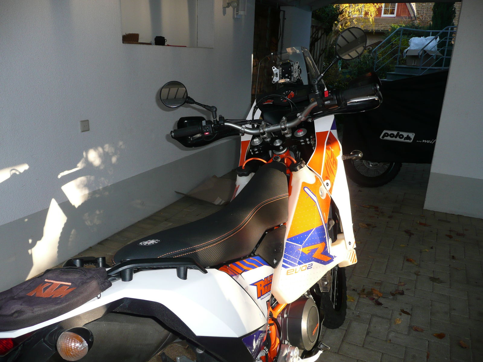 ...und so sieht die klare Maske an meiner 690RallyRaid nun aus. Leider steht sie etwas unter Spannung an den obersten zwei Verschraubungen, das werde ich aber leicht nacharbeiten können. Auch die neue Sitzbank von Seat-Concepts ist nun drauf. Sehr rutschfester Bezug, die Seitenteile carbonfaserverstärkt, orange Zierdoppelnaht, Sitzschale deutlich stabiler als Serie, plug and play. Für 426 Euro (inkl. Versand) aus Dänemark bezogen, weil sie dort am Lager war. Standardhöhe, ist aber rund 1cm höher als die Seriensitzbank (ab 2014). Freue mich auf die Probetour, wenn der Nebel mal verschwindet...