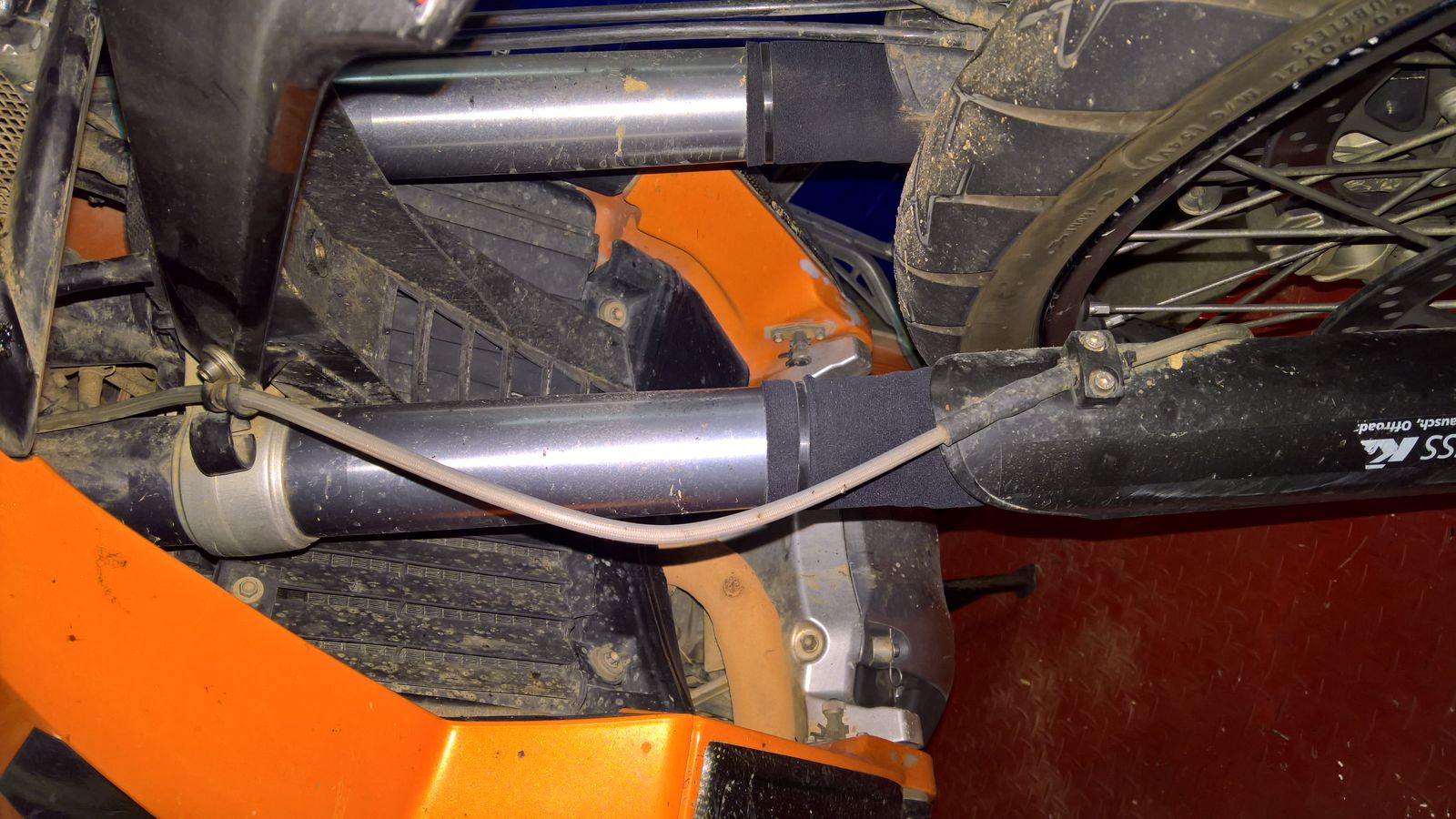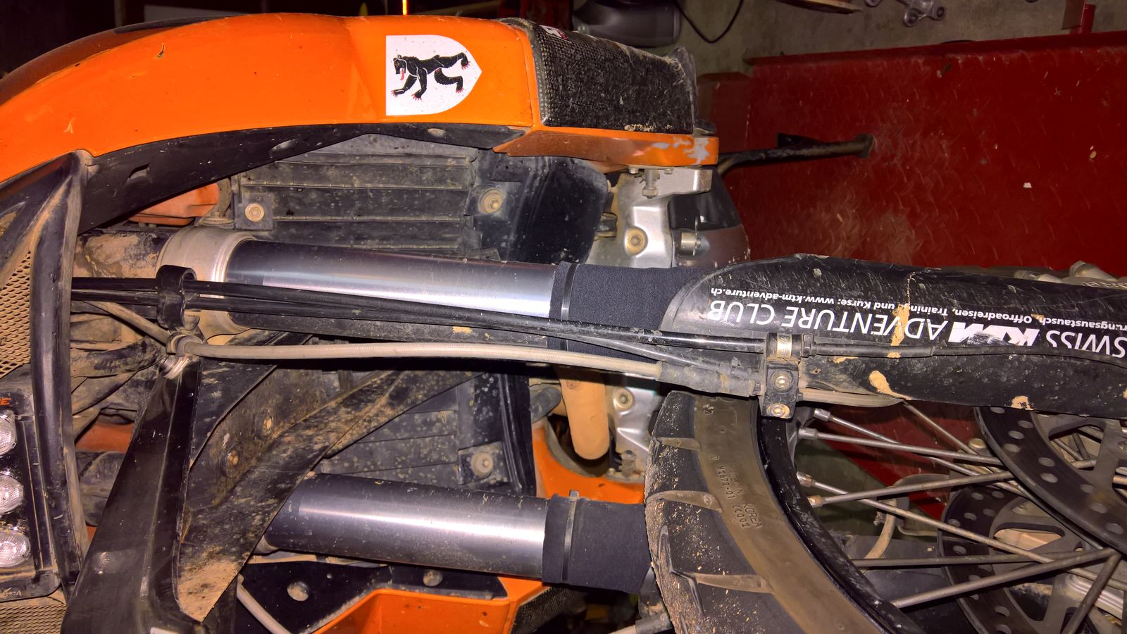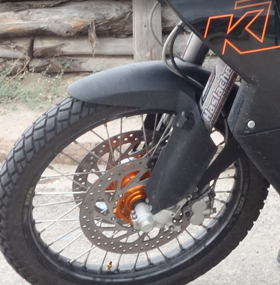 Bei den Dakar Motorrädern habe ich gesehen, daß die Bremsleitungen fest am Kotflügel und der Gabelbrücke sind und sozusagen im Bereich der Gabelrohre mitfedern. So ähnlich scheint das auch bei den 990er Adventure zu sein.
