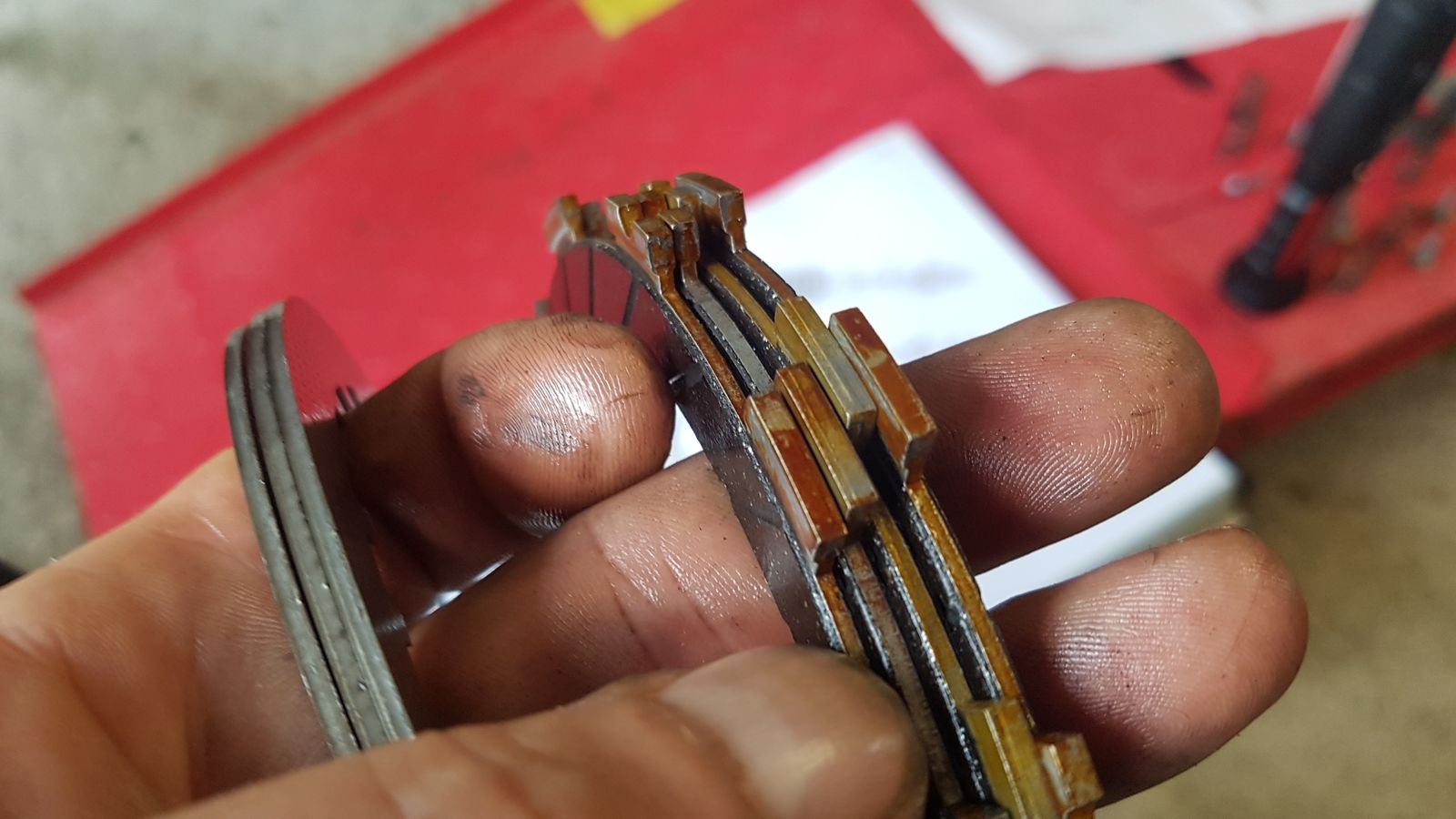 Da die erste und letzte Lamelle nicht original waren, ist nun wohl der kupplungsmitnehmer so weit eingelaufen, dass die erste Lamelle, obwohl null Verschleiß, die stützscheibe und die Tellefeder nicht mehr weit genug von der ersten stahllamelle trennt.