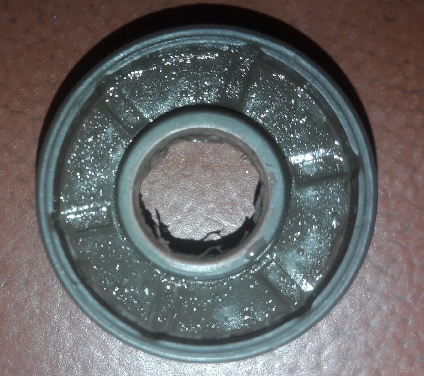 Dichtring leicht ausgefranst und Welle hat schöne Riefen. So schaut das aus bei c.a. 38.000 km , gegen das Licht gehalten sieht man schön die Vertiefung wo die Dichtlippe gelaufen ist blink
