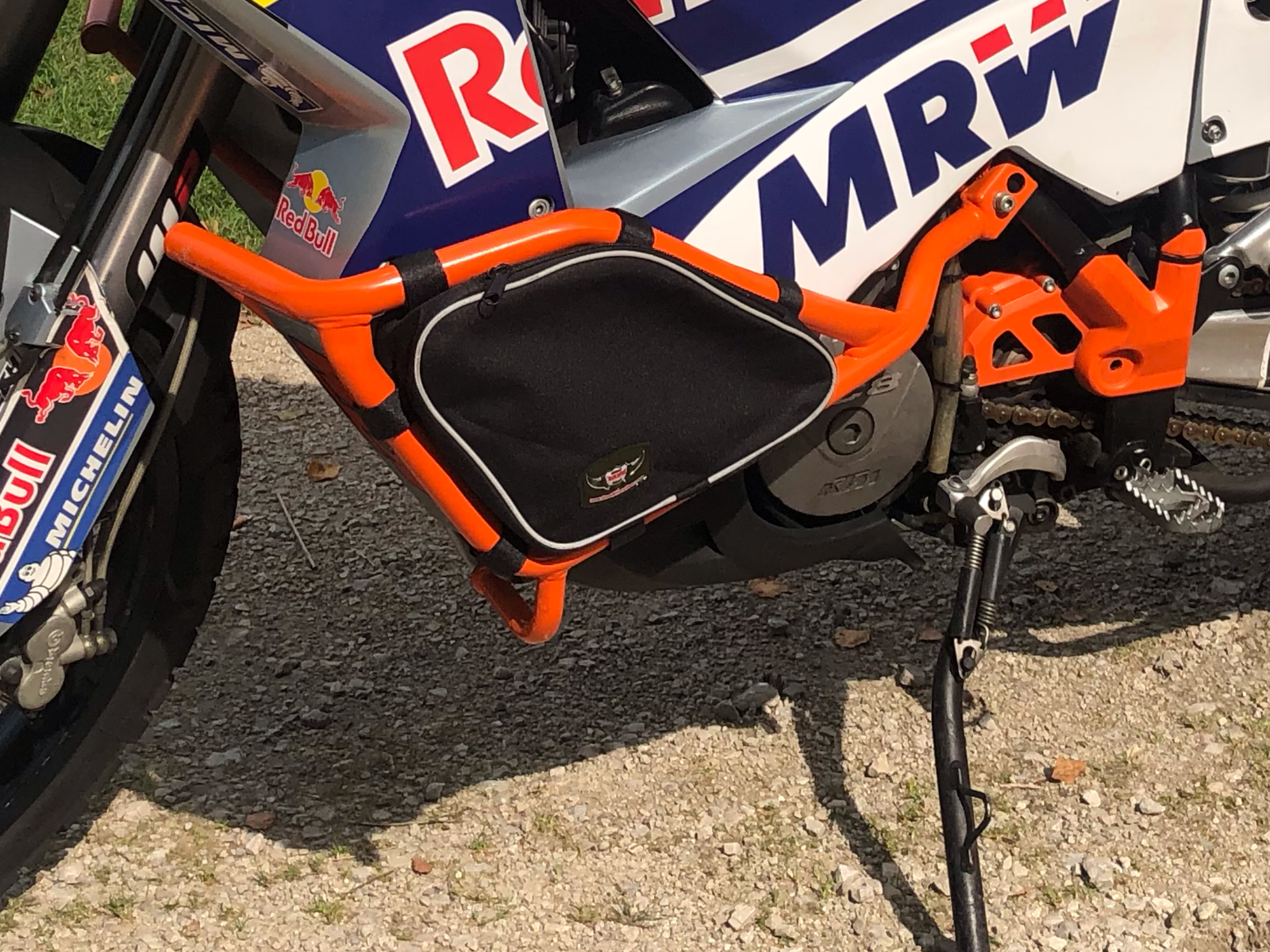 Habe mir von Marselus ( https://www.marselus.com/en/e/ktm-90/ktm-950-990-175/ ) für meine SW-Motech-Sturzbügel passende Täschchen geholt Ganz gezielt mit orangefarbenen Kanten Bin begeistert. Volumen ist eher gering, da die Taschen zum Glück nicht so Hamster-backig sind und nicht soweit rausstehen. Und ob die wasserdicht oder immerhin stark abweisend sind, kann ich auch nicht sagen. Die Ausführung des Reißverschlusses läßt es zumindest vermuten. Sitzen schön mittig im Rahmen und werden an Wasser unempfindlichen Kleinkram aufnehmen, was sonst wertvollen Platz an anderer Stelle eingenommen hat. Kontakt ist super und Versand war auch flott. Der angegebene Preis ist pro Set (Taschen re./li.) + Versand = 40 EUR. Kann man nix sagen, meide ich.