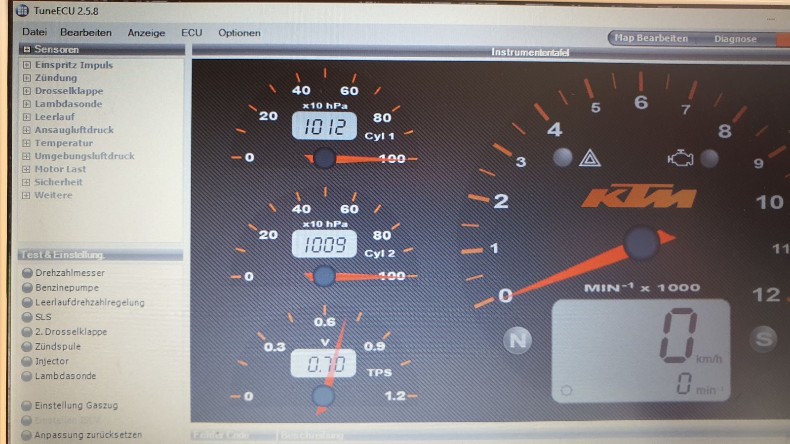 Zu Hause TunerECU ran um den Fehlerspeicher auszulesen (s.o.). Ein paar Bilder von den Anzeigen habe ich mal gemacht. Motor aus und Vollgas werden nur 95% angezeigt. 4% wenn der Gashahn zu ist (Moped hatte da noch Restwärme).