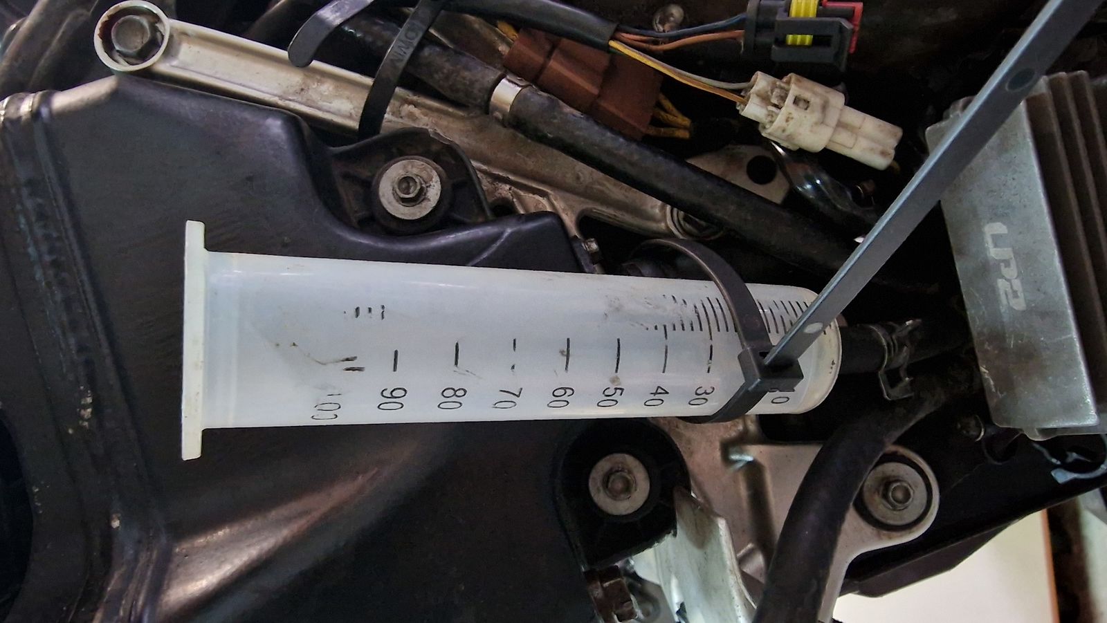 Da der linke Tank ja nicht vorhanden war, stülpe ich immer eine große 100ml Spritze auf den Benzinschlauch. Man kann dann gut sehen, wie die Pumpe arbeitet.