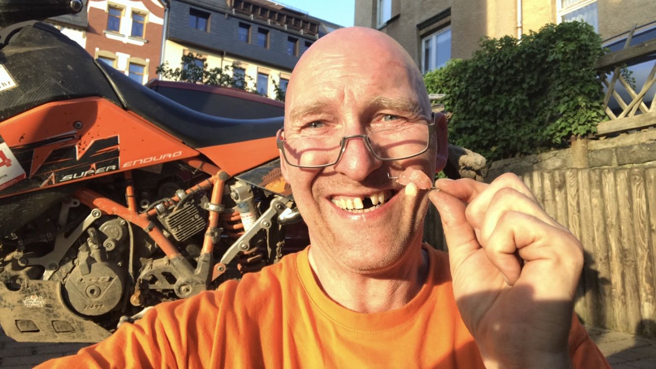 Dann hat alles bissl gelegen, dann war mein Dekraexperte im Urlaub und dann hat er den Rahmen bei mir abgeholt, mit nach Zwigge genommen , für de unhießigen: Zwickau ,