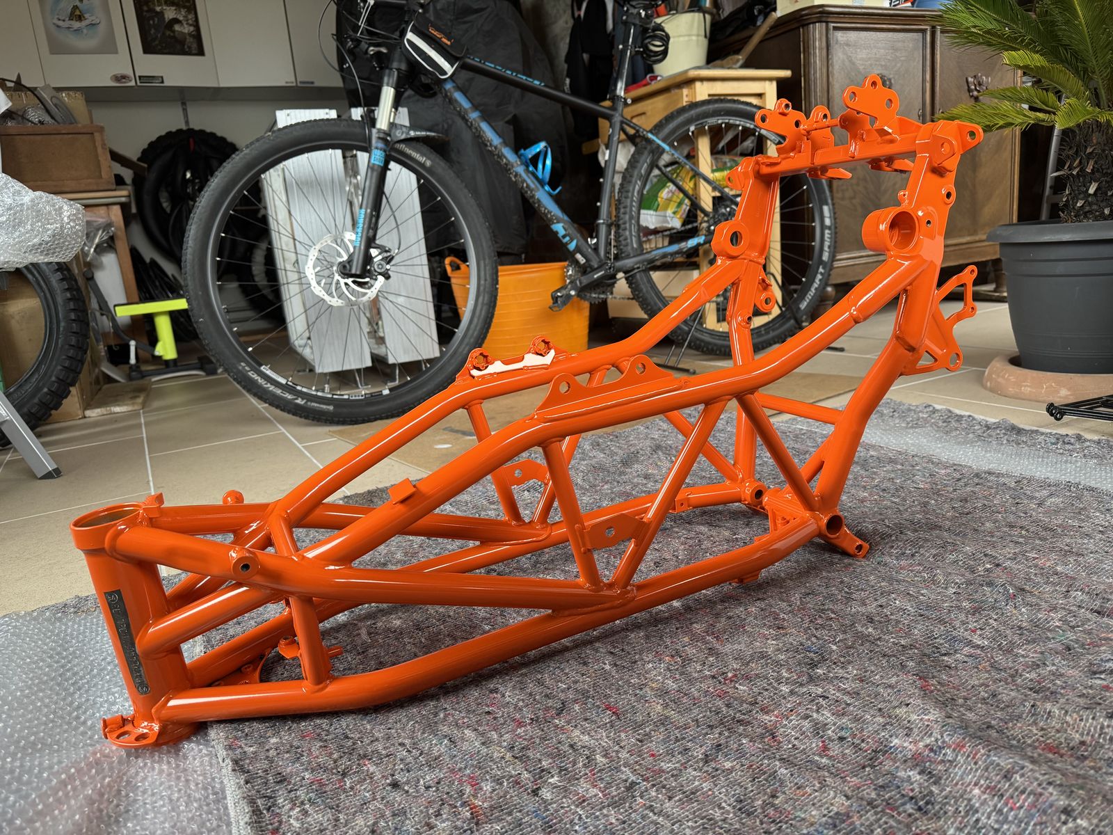 Der gerichtete SE Rahmen ist inzwischen orange gepulvert und eigentlich ist alles komplett u es wird der Zusammenbau starten.