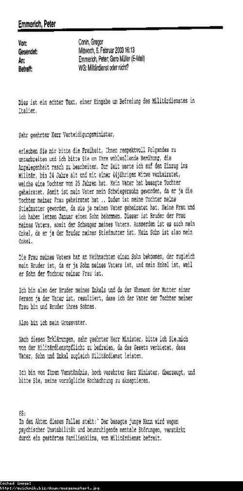 |   Das einzige, das hier gestört ist, ist die Begründung der Militärdienstbefreiung. Ist doch ein geniales Kerlchen. Ich würde ihn zum Bundeskanzler ernennen, wenn ich könnte.