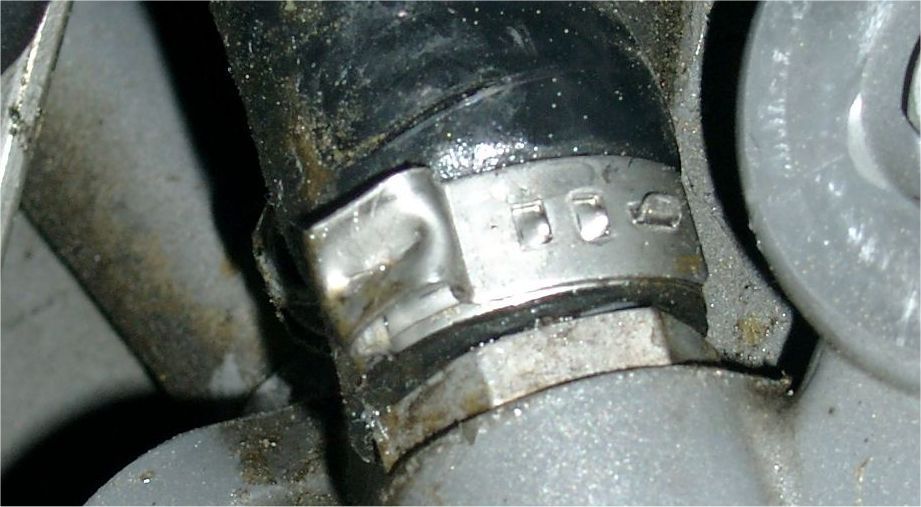 Da ich auch Probleme mit leichtem Kühlwasserverlust habe schaute ich mal genauer nach, und ich stellte fest, dass der Schlauch am Anschluss zur Wasserpumpe eingerissen ist !!