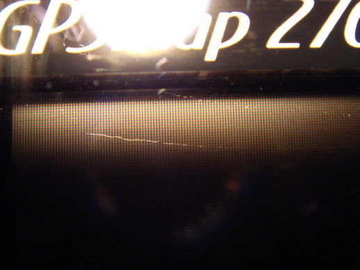 Nach meiner letzten Tour habe ich den 276C außen gereinigt. Als er wieder ganz sauber war entdeckte ich 2 komische Streifen aufm Bildschirm. Einer ca. 5-6mm unter der oberen Kante, der andere 2-3mm oberhalb der unteren Kante. Mit einer Lupe habe ich genau nachgeschaut ob es irgendwo Anzeichen von Einschlägen etc. gibt. Die gibt es definitiv nicht. Die Kiste ist immer hinter der Schutzscheibe oder in einer weichen Tasche gewesen. Wasser hat es eigentlich nie gesehen. Die Punkte sind mit Sicherheit keine Pixelfehler. Das sieht man genz deutlich mitm Vergrößerungsglas. Sie sind irgendwo unter der obersten Glasschicht.