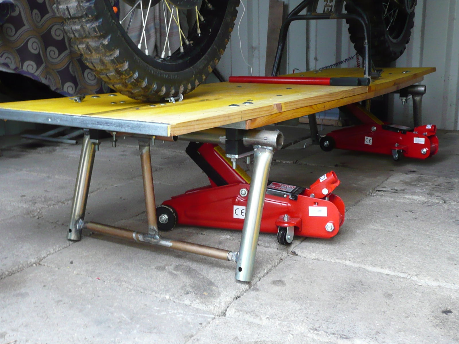 Die Grundfläche beträgt jetzt 500x2000mm, im Bereich der Doppelung (1500x500mm) ist die Platte 40mm dick. Die niedrigste Höhe ( zum Auffahren der Maschine) ist ca. 150mm, die Höhe auf dem eingerasteten Grundständer liegt derzeit bei ca. 320mm (Oberkante Platte). Durch stufenweises anheben und unterbauen der Wagenheber und Ständer mit Hilfskonstruktionen (z.B. stabile Quader/Kästen aus Multiplexplatten) lässt sich die Montagehöhe bis fast ins Unendliche steigern (man denke an diverse Pyramiden- oder Tempelbautechniken).