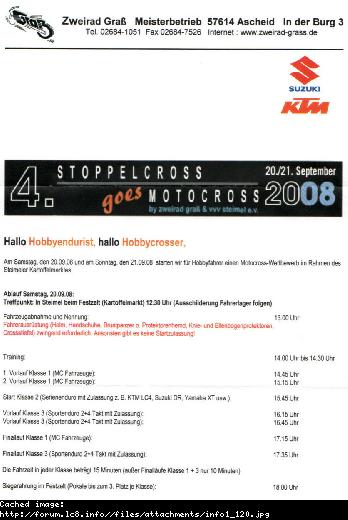 Also, es verdichtet sich, dass wir zum Stoppelcross in den Westerwald kommen, d.h. Thomas+Romy & Rico+Yvonne, Anreise mit Transporter und Hänger mit 2 LC4 (Mädels nur Zuschauer). Anreise Fr. Abend Abreise So früher Nachmittag. Wir freuen uns.