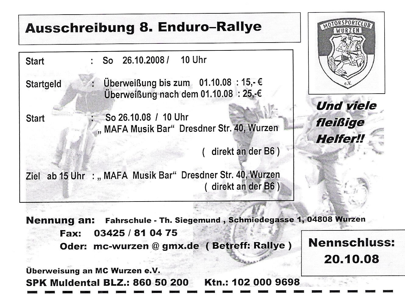 Am 26.10.08 findet die 8. Enduro-Roadbook-Rallye des MC Wurzen statt.