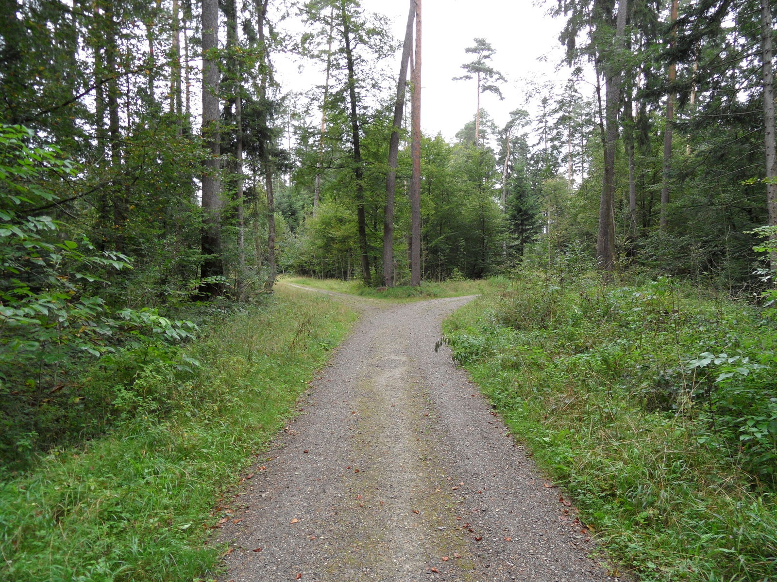 | In der Gabelung steht ein Baumstrunk |